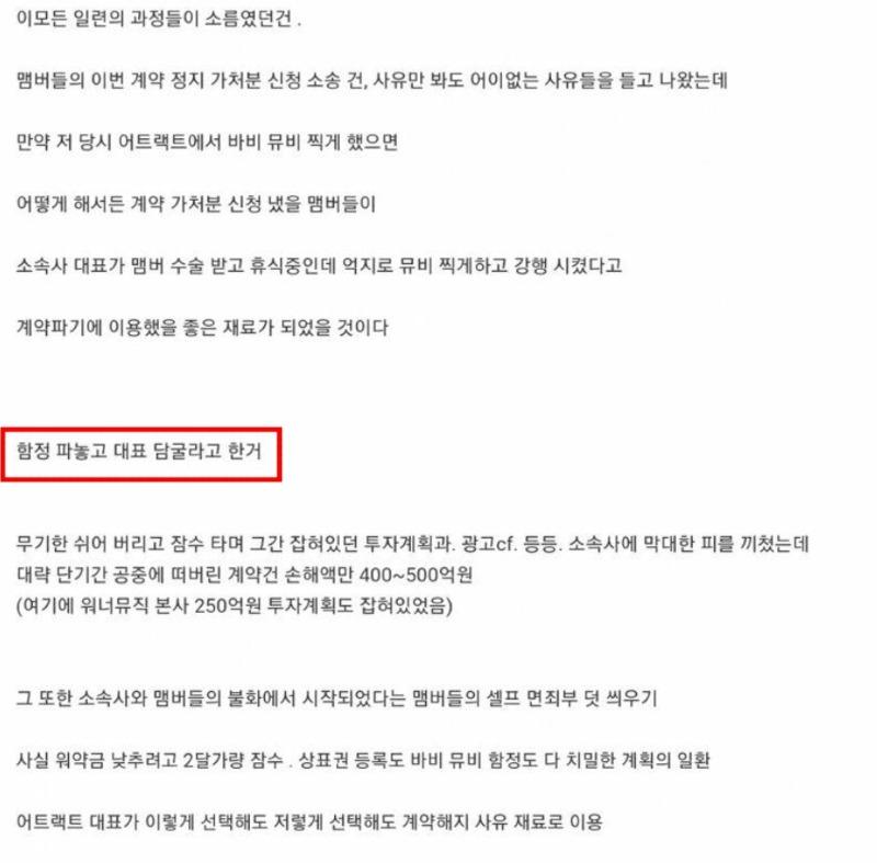 그런데, 여기서 더 충격적인 사실은 소속사와 멤버들 사이에 진행된 계약 효력 정지 가처분 소송에서 제기된 주장들입니다. 만약 그 당시에 어트랙트가 바비 뮤비를 촬영하게 했다면, 멤버들은 그것을 계약 파기 사유로 이용했을건데 말이죠.