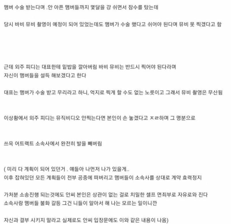 며칠 전, 피프티 멤버가 수술을 받아야 해 바비의 뮤직비디오 촬영을 못하게 되었음에도, 외주 PD는 반드시 뮤비 촬영을 해야 한다며 멤버들을 설득하려 했다고 합니다. 그러나 대표는 멤버가 수술을 받고 무리라는 이유로 뮤비 촬영을 진행할 수 없다고 결정했고, 결국 뮤비 촬영은 무산되었죠.