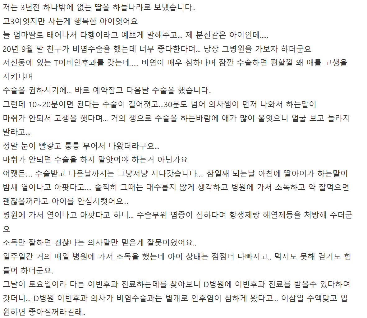 수술을 진행했던 병원과 입원 치료를 진행했던 병원 두 곳 모두 그들의 잘못은 없다며, 딸의 면역력 약화를 원인으로 돌리고 있습니다. 그러나, 엄마의 마음은 참을 수 없이 아프고 억울합니다.