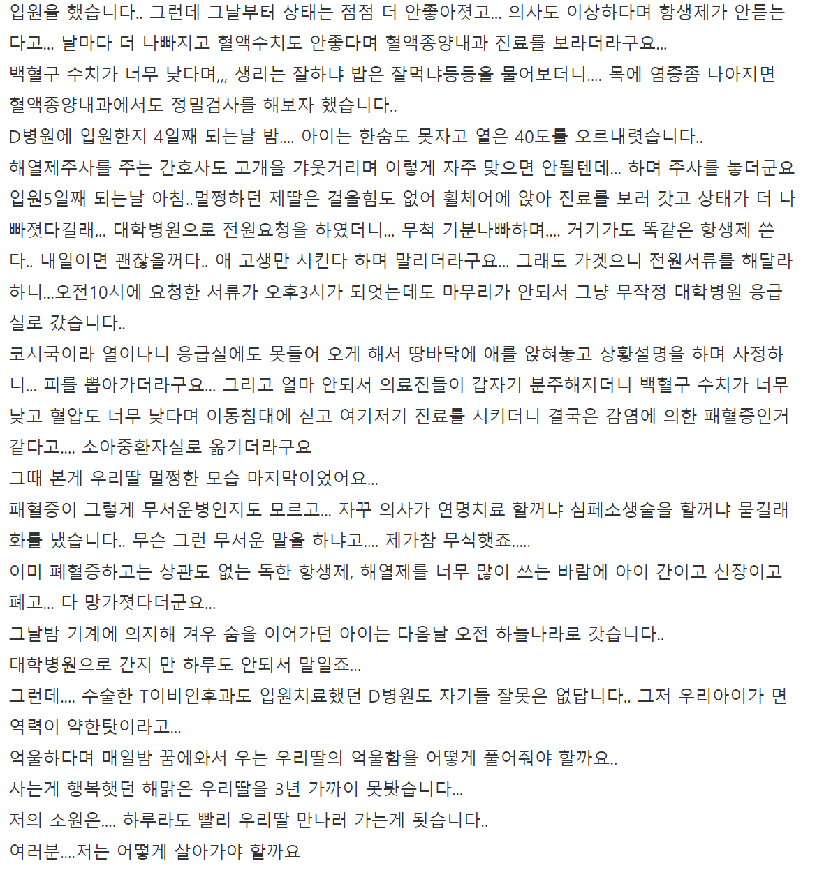 딸이 병원에 입원한 지 4일째 되는 밤, 그녀는 40도의 고열에 허덕이며, 이후에는 감염에 의한 패혈증으로 판명받아 중환자실로 옮겨졌습니다. 그러나 그것이 딸을 마지막으로 볼 수 있었던 시간이었습니다. 그 이후, 딸은 하늘의 별이 되었습니다.