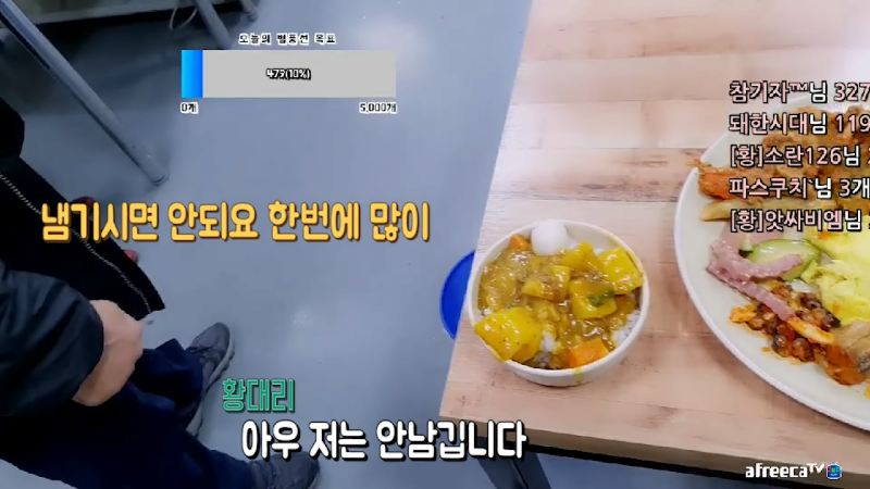 지난 12일, 황대리는 야외 방송 도중 한식 뷔페집을 방문했습니다. 샐러드, 김치, 계란찜, 양념게장, 버섯볶음, 전 등 다양한 반찬을 담은 그의 접시는 시청자들과 함께 했습니다. 하지만 뷔페의 사장은 황대리의 접시를 보고, "남기시면 안 돼요. 한 번에 많이 담으면 안 된다"라고 지적했습니다. 이에 황대리는 "저는 안 남깁니다"라고 반박하며 먹을 준비를 했습니다.