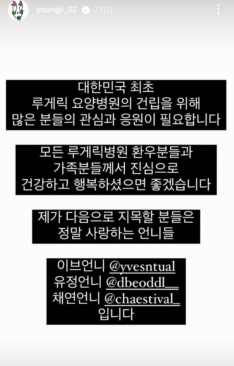 이영지는 "대한민국 최초의 루게릭 요양병원 건립을 위해 많은 사람들의 관심과 응원이 필요하다"고 말하며 그녀는 또한 "모든 루게릭병 환우분들과 그들의 가족들이 건강하고 행복하기를 진심으로 바란다"고 덧붙였습니다.