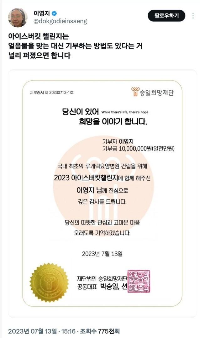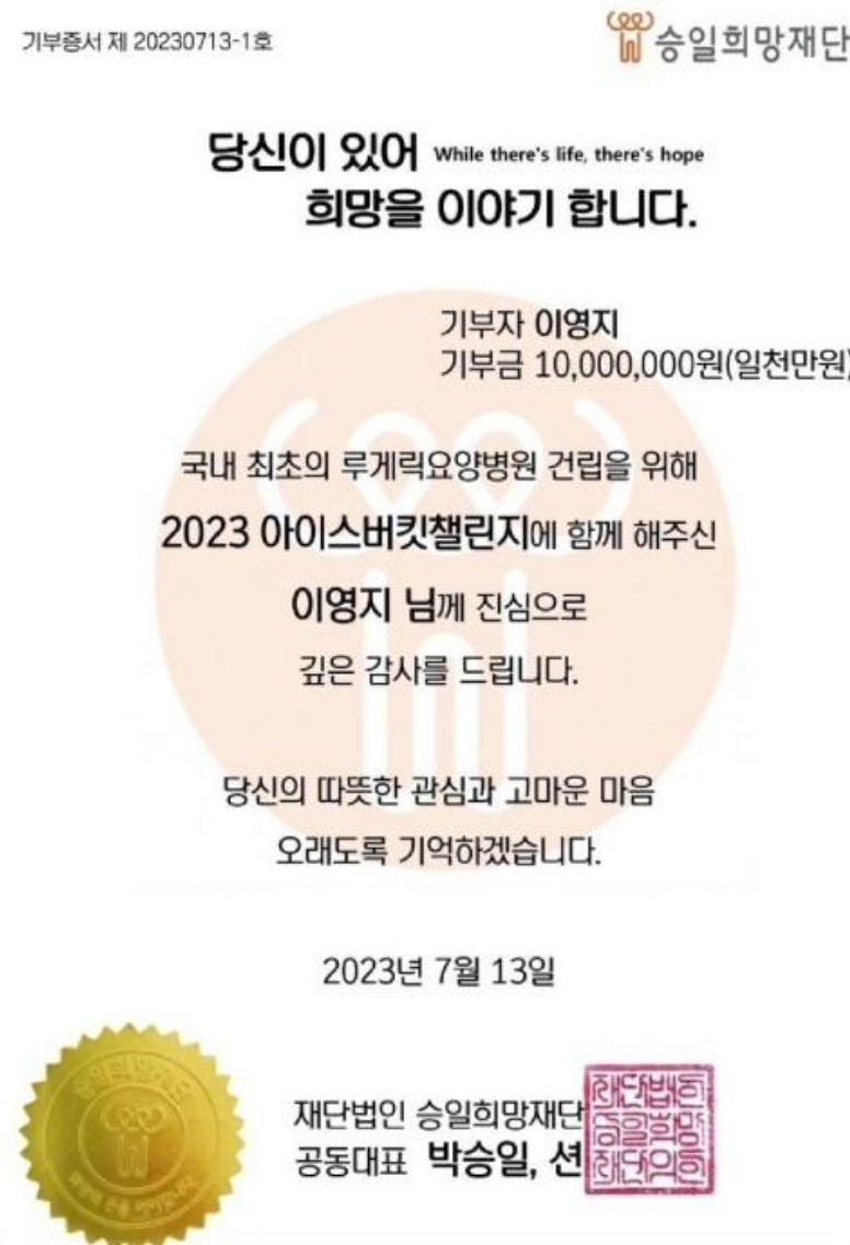 이영지는 자신의 인스타그램 계정을 통해 이 사실을 알렸는데 이영지는"미미 언니(오마이걸 멤버)로부터 아이스버킷 챌린지 지목을 받았지만, 물을 맞는 대신 기부를 하는 방법으로 참여하기로 결정했다"고 적었습니다. 그녀는 이 결정을 공개하면서 승일희망재단에 1000만원을 기부한 것을 증명하는 기부증서를 공유했죠.