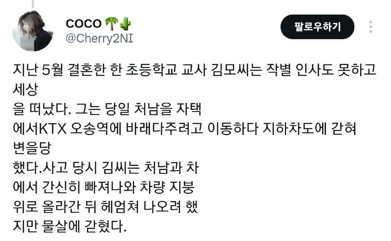 지난 5월 결혼한 한 초등학교 교사 김모씨는 작별 인사도 못하고 세상을 떠났다. 그는 당일 처남을 자택에서KTX 오송역에 바래다주려고 이동하다 지하차도에 갇혀 변을당했다. 사고 당시 김씨는 처남과 차에서 간신히 빠져나와 차량 지붕 위로 올라간 뒤 헤엄쳐 나오려 했지만 물살에 갇혔다.
