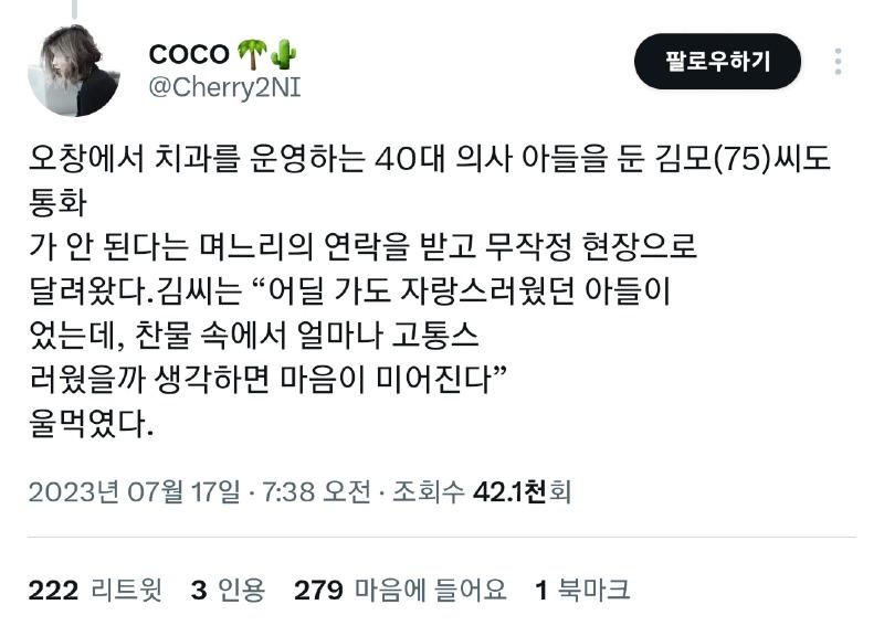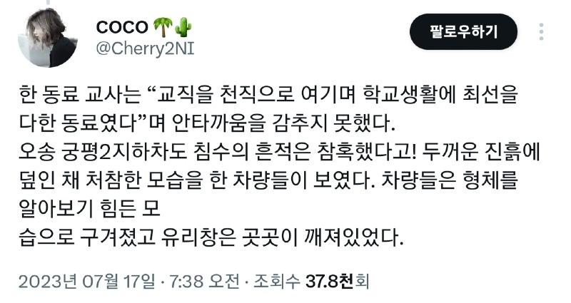 이번 수해로 황망하게 유명을 달리하신 모든 분들께 명복을 빕니다.