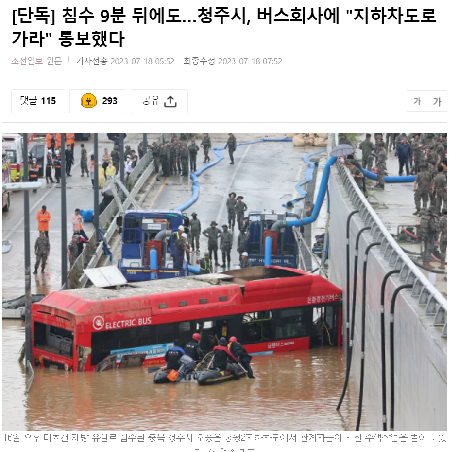 몇시간 전 뉴스에 청주시 버스회사에서 침수가 되었지만 지하차도로 가라 통보했다는 뉴스가 올라왔습니다.
