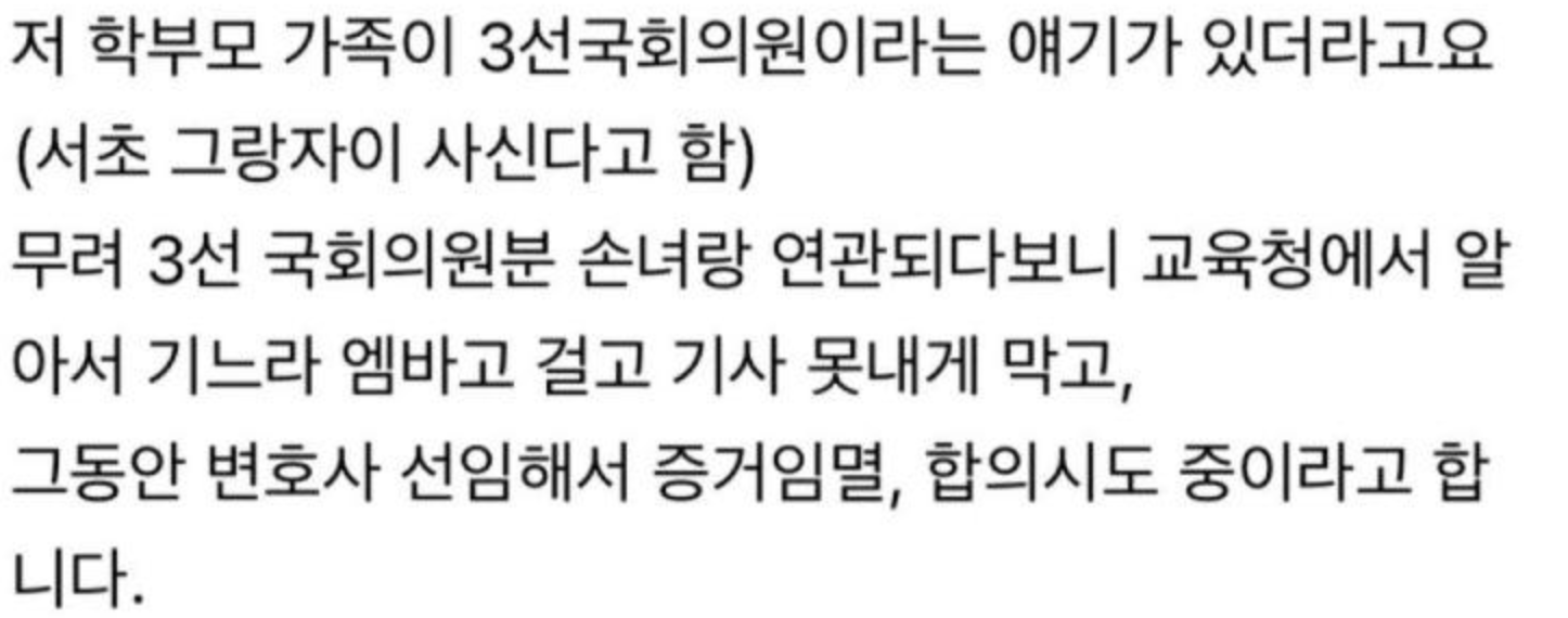 이와 관련하여 소문으로는 해당 학부모의 집안이 매우 높은 사회적 지위를 가지고 있어 언론에 접촉하면서 기사가 나오지 않게 막고 있다는 주장이 나오고 있으며 심지어는 국회의원과 연관되어 있다는 말도 있습니다.
