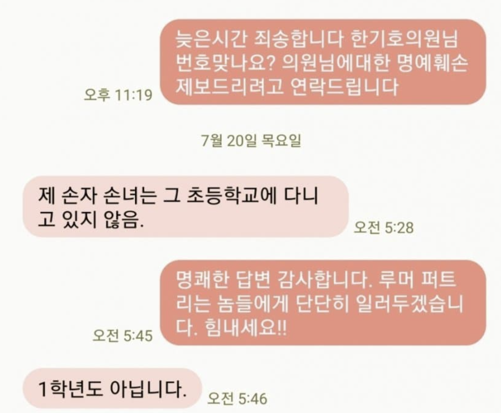 한 블로그에서 한기호의원에게 제보문자를 했었는데 답장이 온것으로 보입니다.