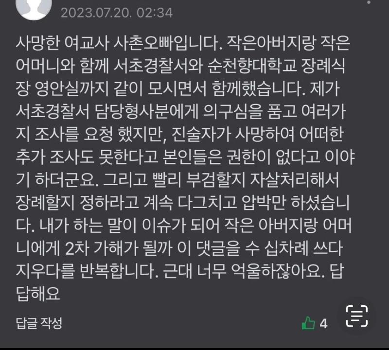 서이초 여교사 사촌오빠의 호소문... 유서가 없다? 구린내가 난다! (0) | 2023.07.20 |