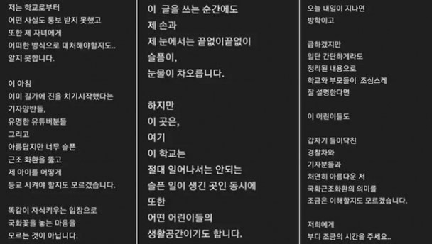 "교문에 슬픔의 꽃이 쌓이고, 학교 주변에는 근조 화환과 언론의 눈이 가득하다"며, "아이들에게는 이 사건을 어떻게 설명해야 할지, 어떻게 학교 생활을 계속해나가야 할지가 절실한 문제"라고 걱정했습니다.