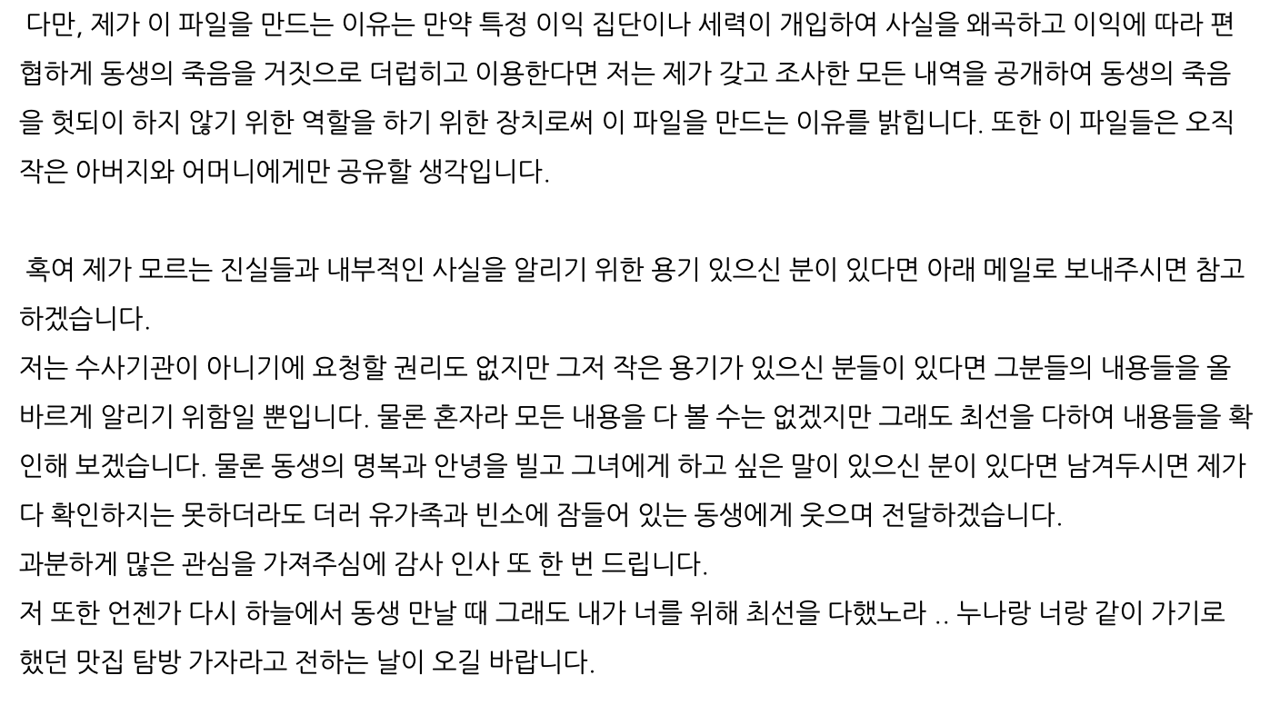 마지막으로, 저희 가족은 이 힘든 시간을 견디는 것이 더 이상의 고통과 두려움을 가져오지 않고, 오히려 동생의 죽음을 올바르게 이해하고 그를 기리는 데 도움이 되기를 바랍니다. 이러한 바람을 품고, 동생의 죽음에 대한 여러 사실과 진실을 찾아내고자 노력하고 있습니다.