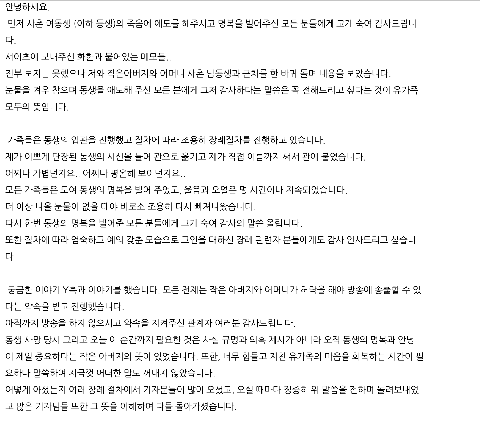그 중간에도 Y측과의 이야기를 진행하였으며, 모든 전제는 동생의 부모님들이 허락을 해야 방송에 송출할 수 있다는 약속을 받았습니다. 아직까지 방송을 하지 않으신 것에 대해 감사의 말씀을 드립니다. 유가족들이 가장 중요하게 생각하는 것은 동생의 명복과 안녕입니다. 그리고 고인을 기리며 힘들게 지내고 있는 유가족들이 회복하는 시간이 필요합니다.