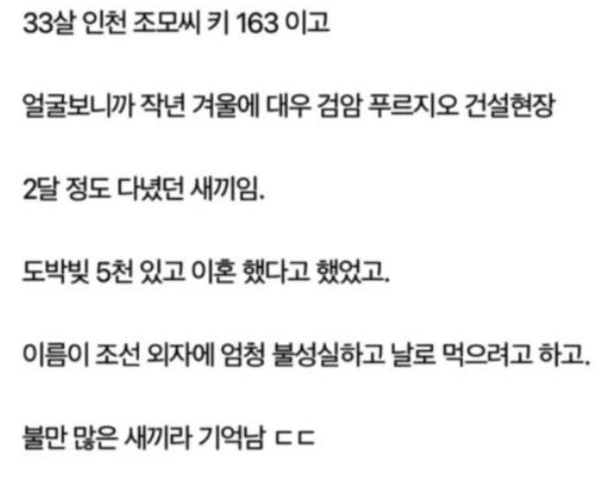 작년에 그와 함께 근무했던 한 동료는 "조씨는 키가 163cm 정도 되는 중년 남성이었고, 불성실하게 일하려는 태도와 불만이 많은 성격으로 기억됩니다."라며, "그는 도박빚이 5천이 넘었다고 말했었고, 이혼했다고 했었습니다."라고 전했습니다.