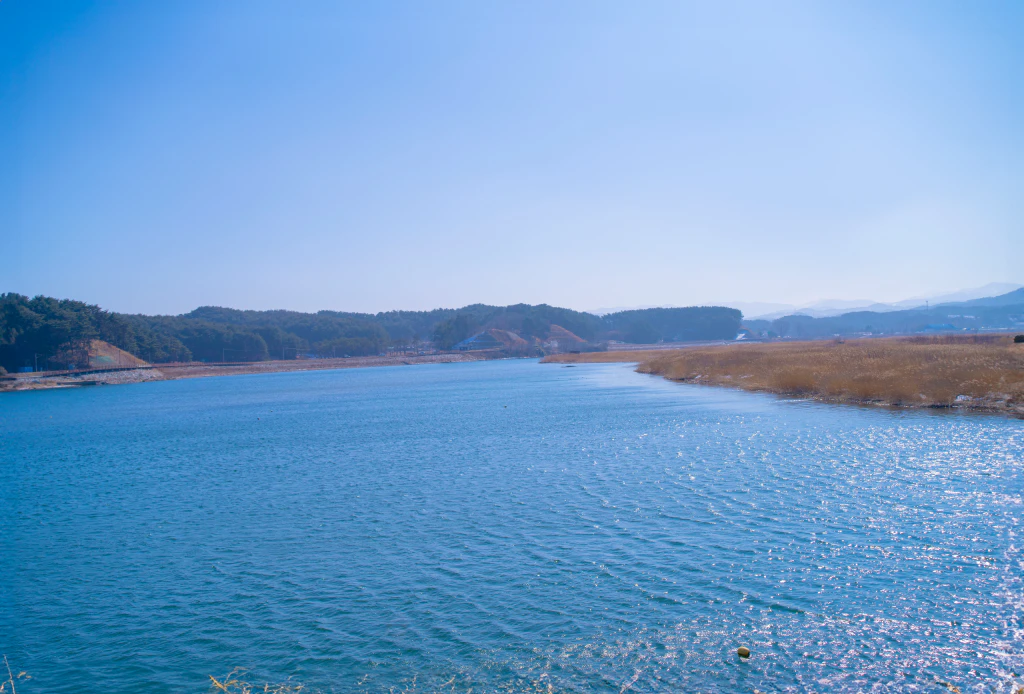 갈대밭, 맑은 강물, 멀리 보이는 산의 조합은