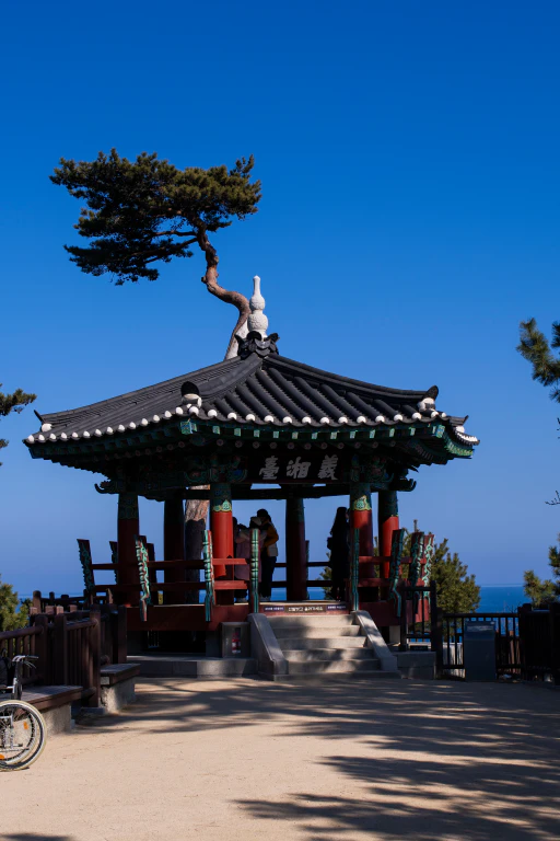 절벽 위에 자리 잡은 정자가 동해바다와 자연스럽게 어우러져,