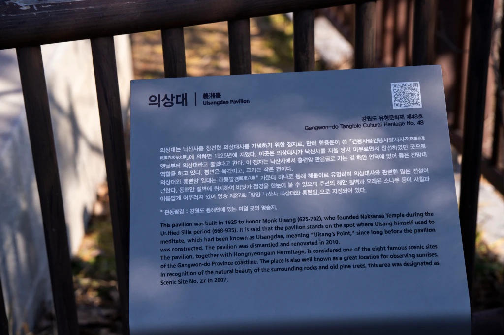 이곳은 동해안 해돋이 명소로도 유명하고, 신라의 고승 의상대사의 수행 흔적을 기리기 위해 세워진 정자이기도 합니다.
