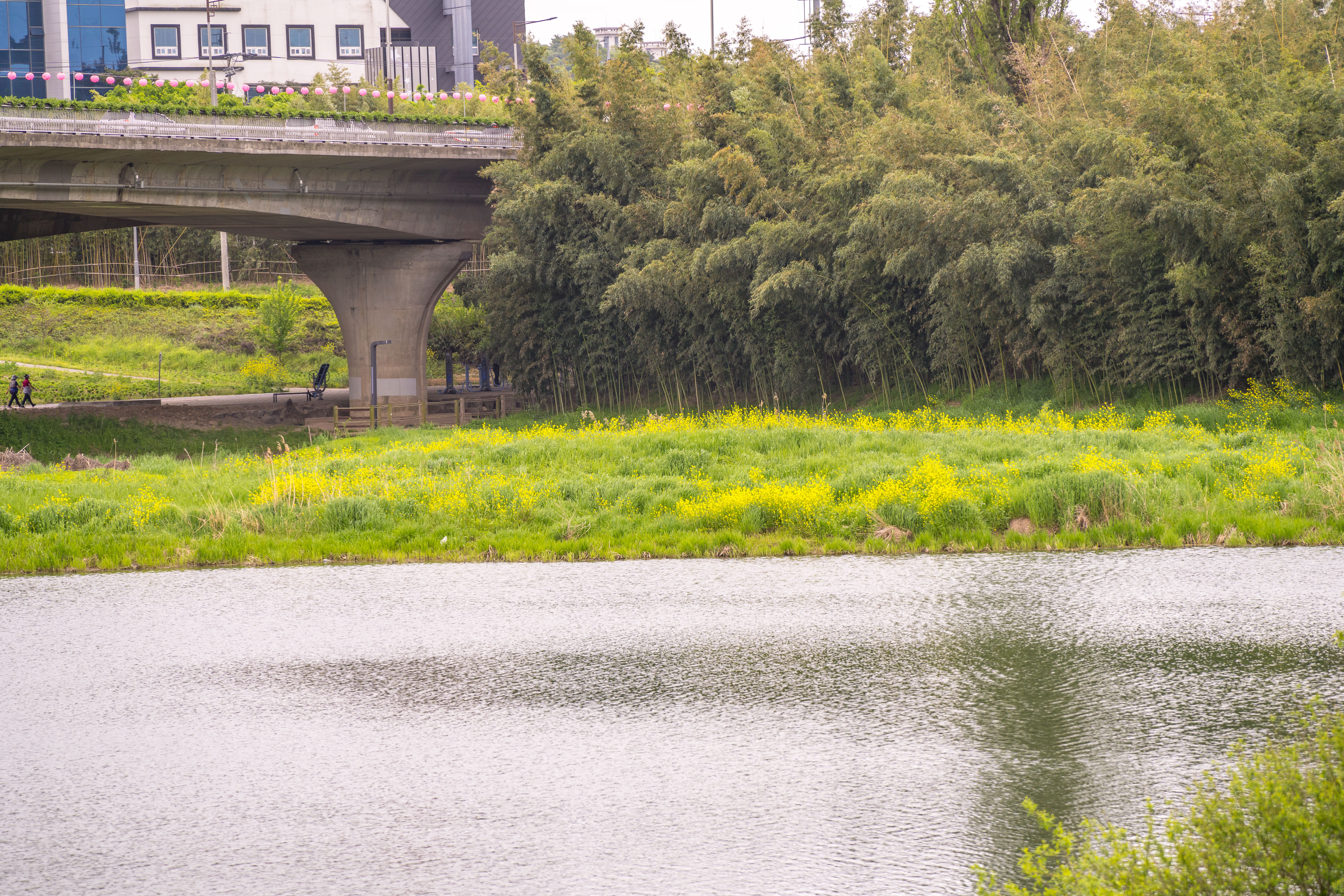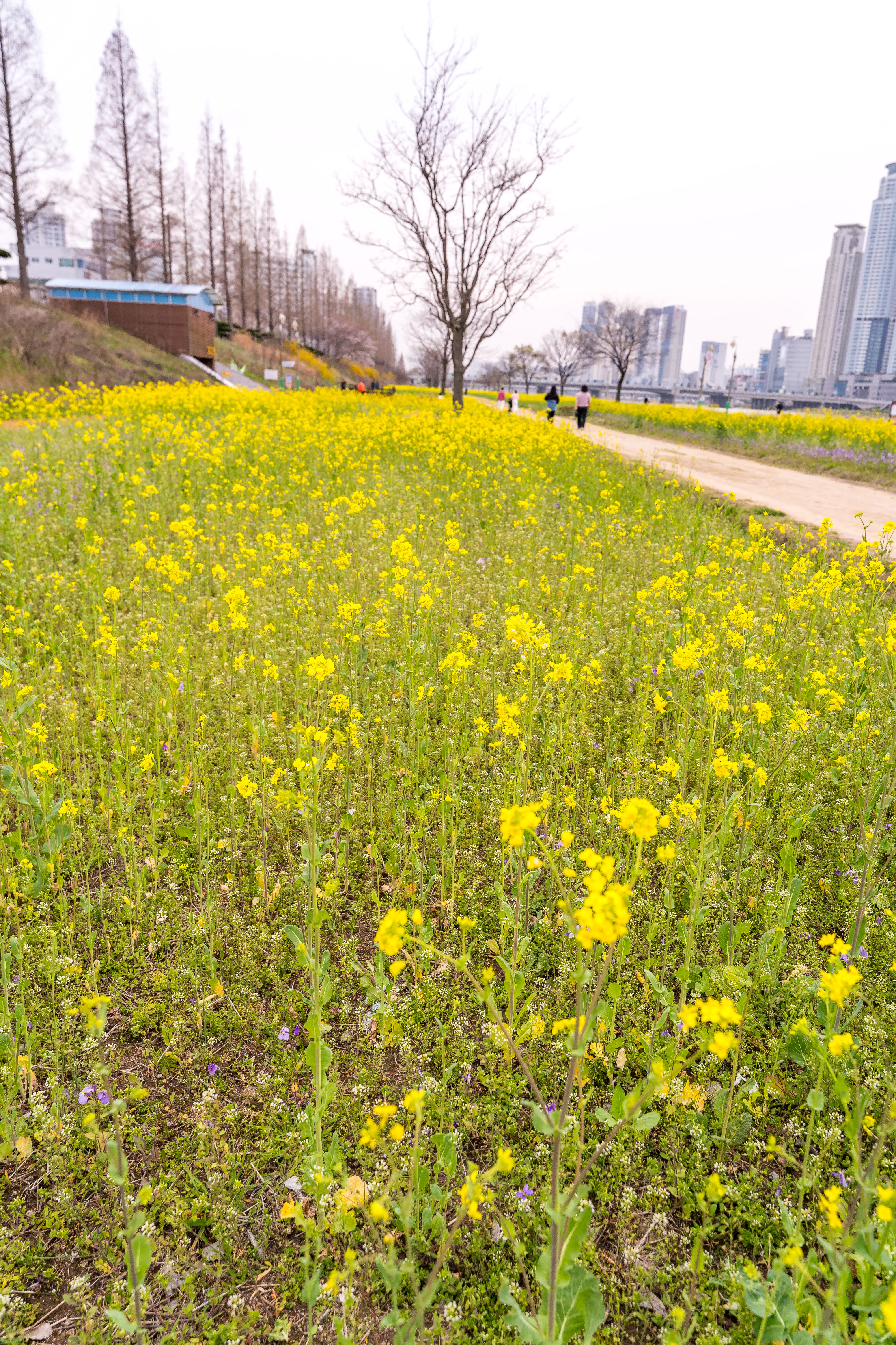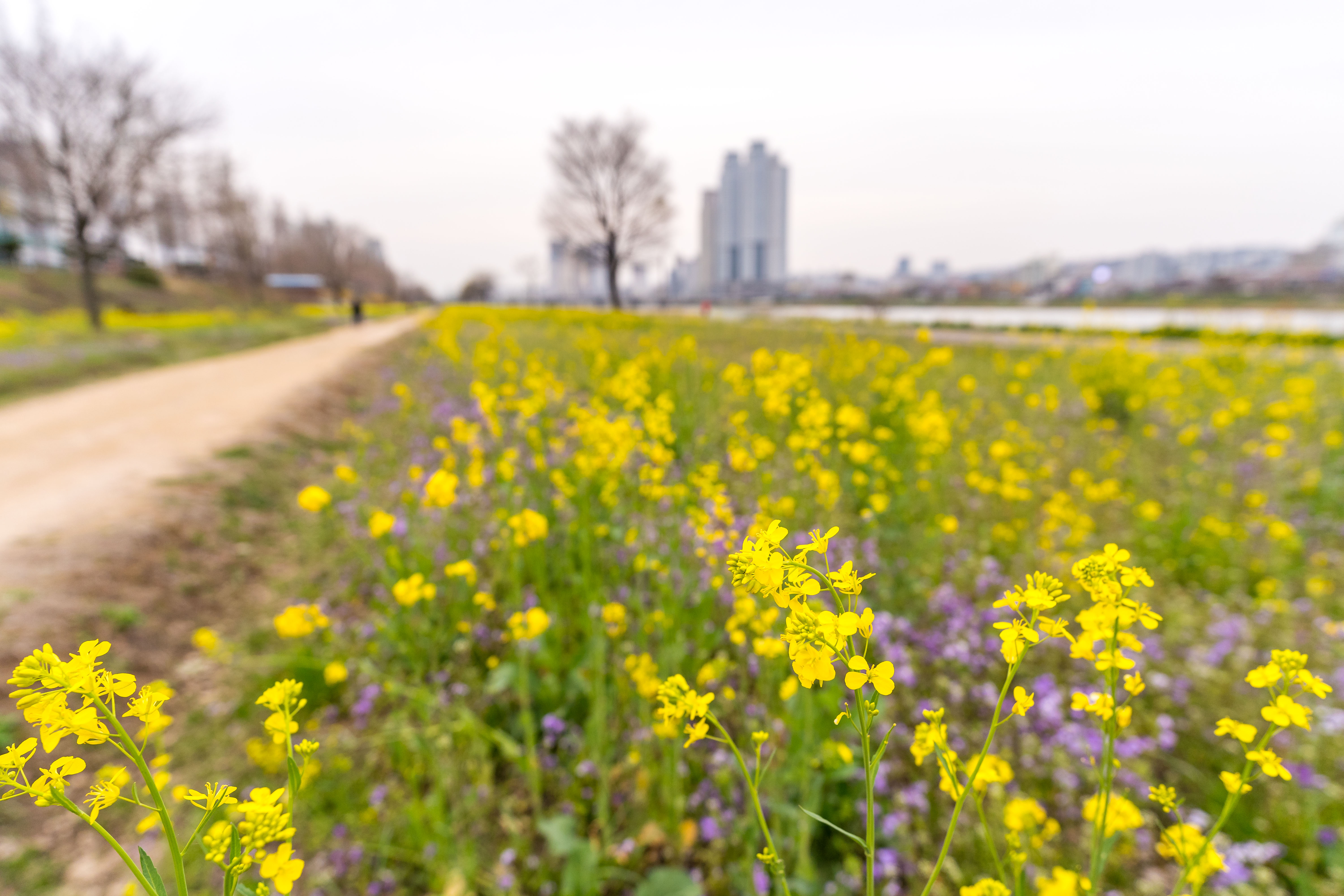강변을 따라 끝없이 이어지는 노란 꽃밭의 스케일이 먼저 압도해요. 가까이서 보면 작은 꽃송이들이 옹기종기 모여있는 귀여운 꽃인데, 그게 수만 송이, 수십만 송이가 한꺼번에 피어있으니 멀리서 바라보면 강변 전체가 노란 카펫을 깔아놓은 것처럼 보여요. 그 앞에 서면 카메라를 꺼내지 않고는 도저히 발걸음을 옮길 수가 없어요 📸