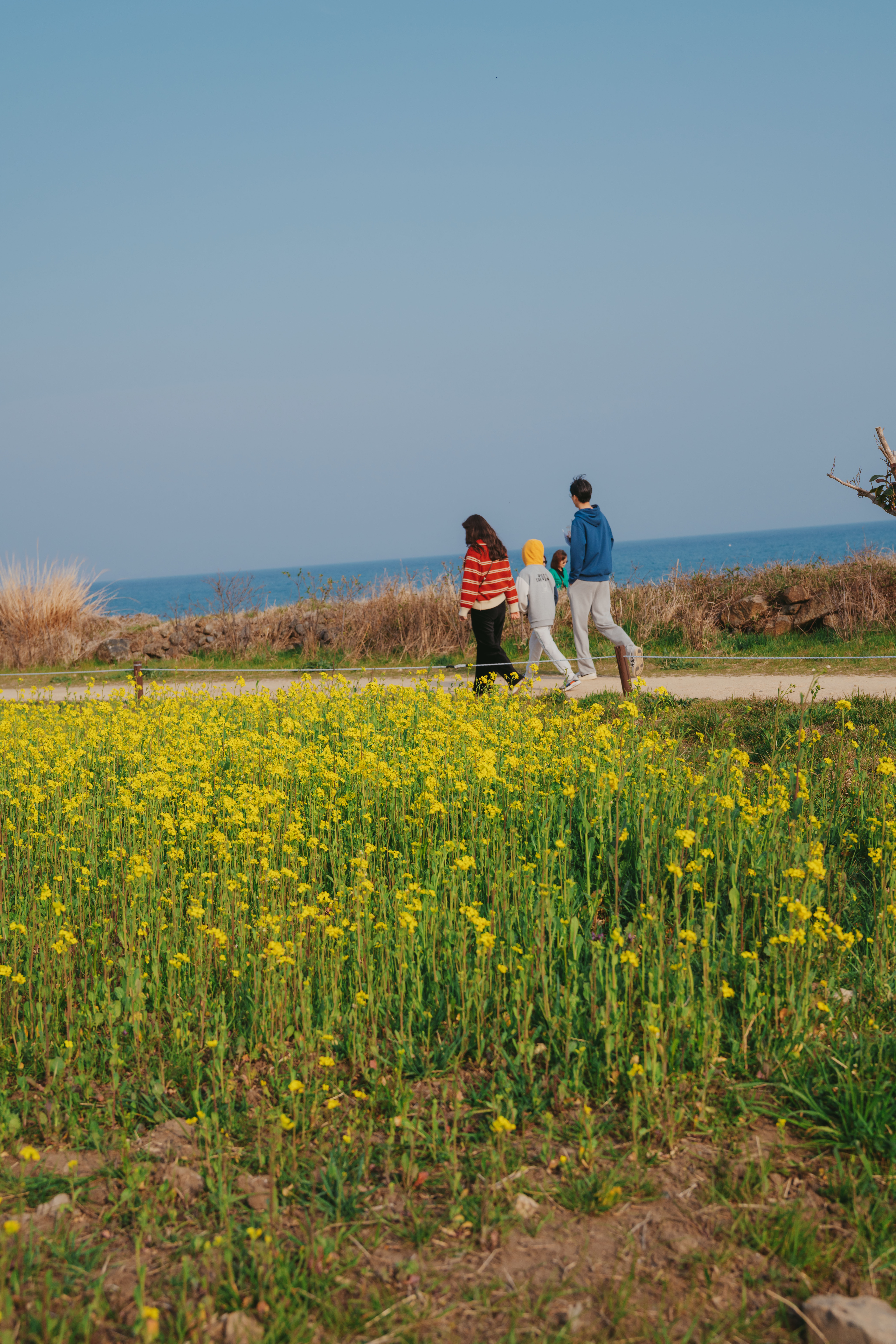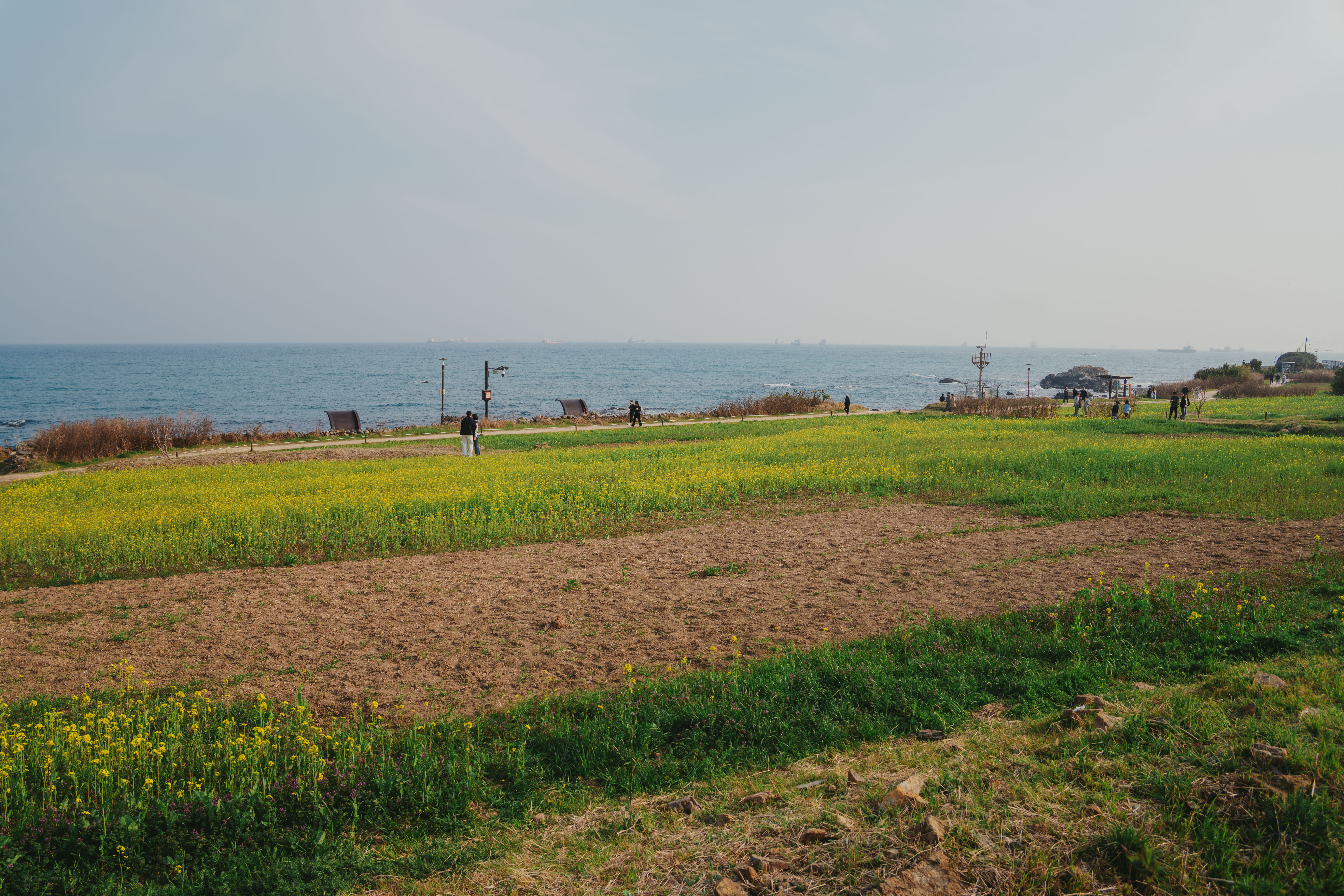 유채꽃밭 뒤로 펼쳐지는 바다 풍경 덕분에 제주도를 떠올리게 하는 분위기를 느낄 수 있습니다.