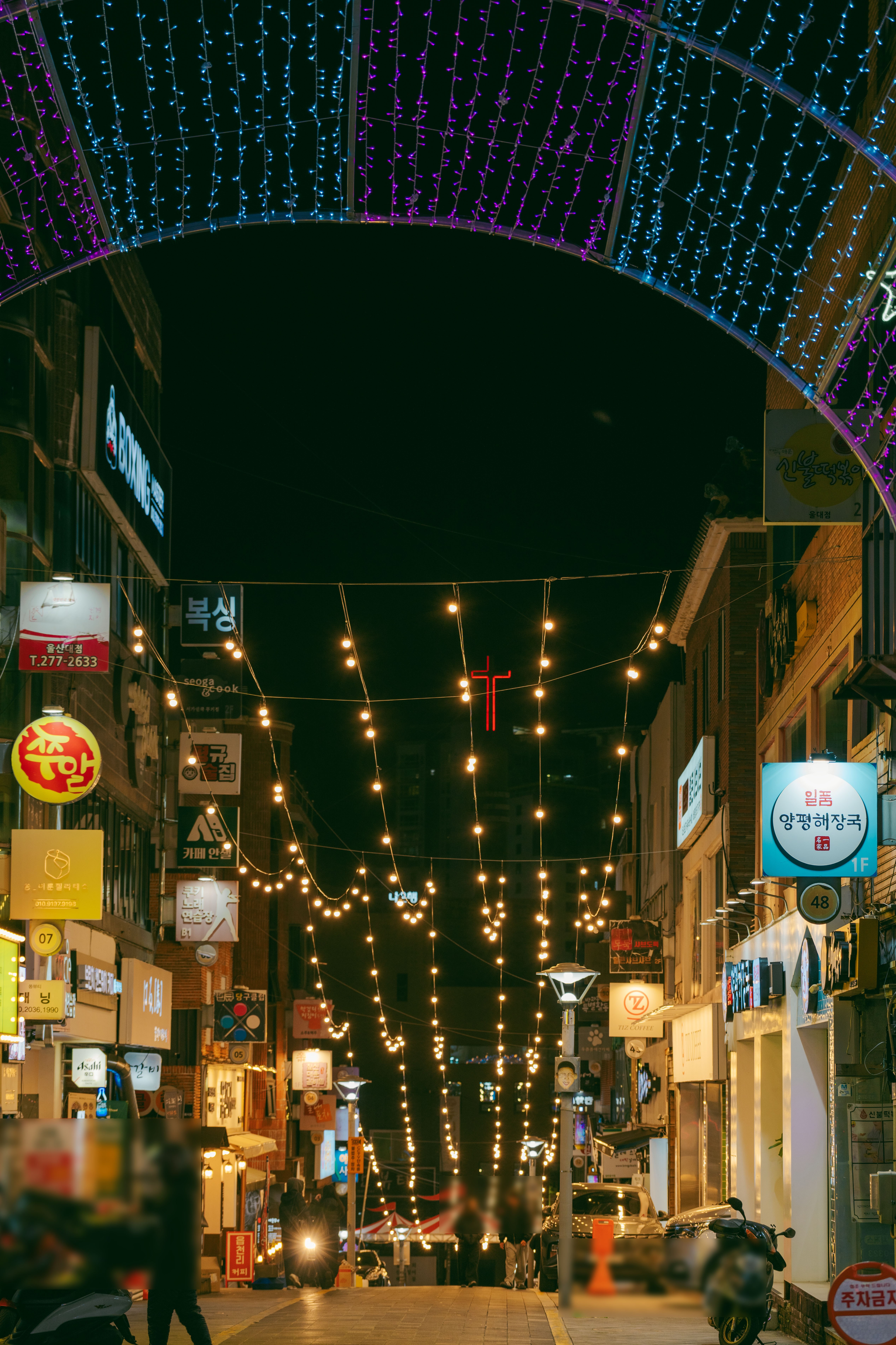 거리 전체가 따뜻한 색감의 조명으로 채워져 있어요.