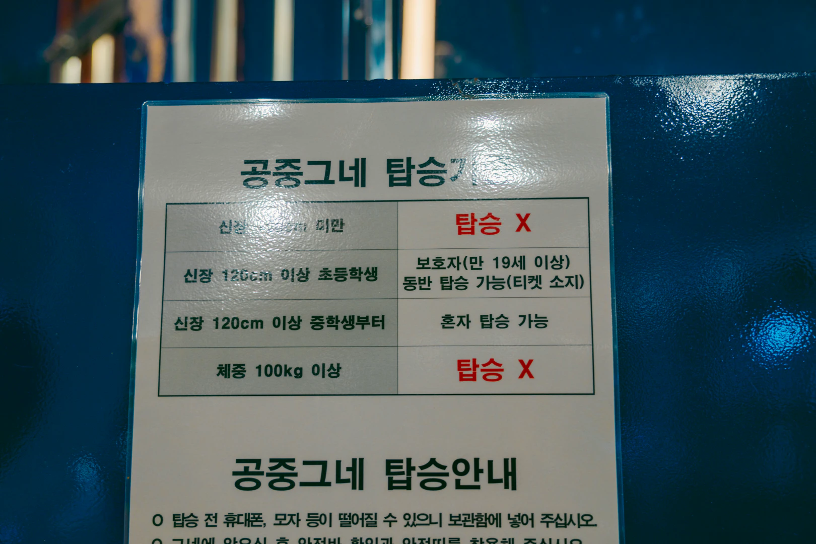 - 주의사항 : 바람 초속 10m/s 이상 시 운행 중단, 탑승 중 휴대폰 사용 금지