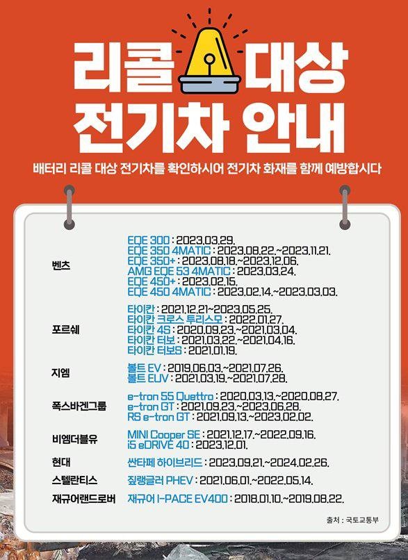 전기차 소유자 여러분께 중요한 안내입니다. 최근 배터리 결함으로 인한 화재 위험으로 인해 다수의 전기차 모델이 리콜 대상이 되었습니다. 해당 차량을 소유하고 계신 분들은 리콜 대상 여부를 확인하시고, 필요한 조치를 취하여 안전을 확보해 주시기 바랍니다.
