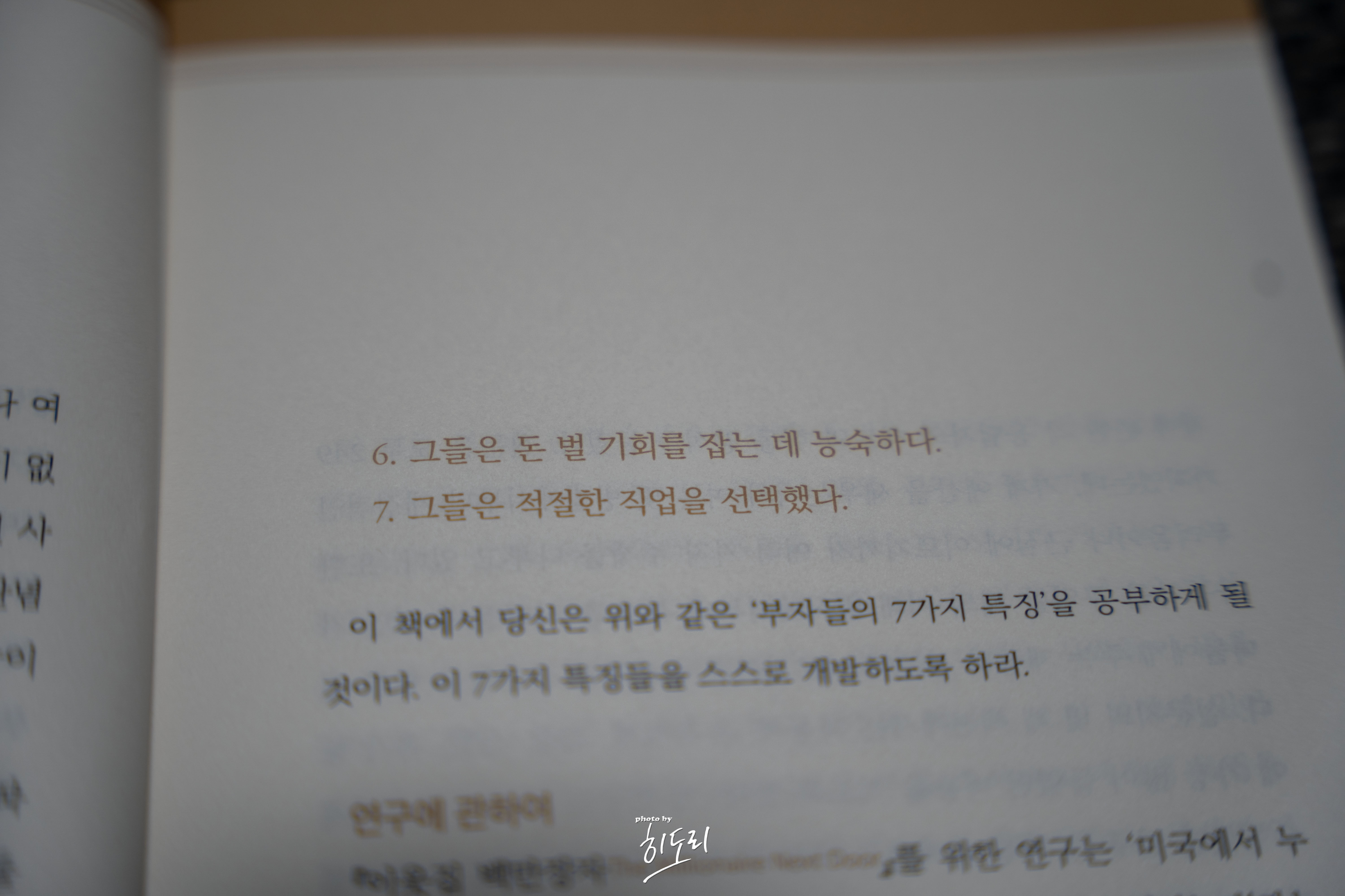 "어떻게 하면 부자가 될 수 있을까? 이 점에 대해 대부분의 사람들은 잘못된 인식을 가지고 있습니다. 부를 축적하는 능력은 행운도, 유산도, 고학력도, 지성과도 관계가 없습니다. 부는 대개 근면, 인내, 계획적이고 자제력 있는 생활 습성으로 얻을 수 있습니다."