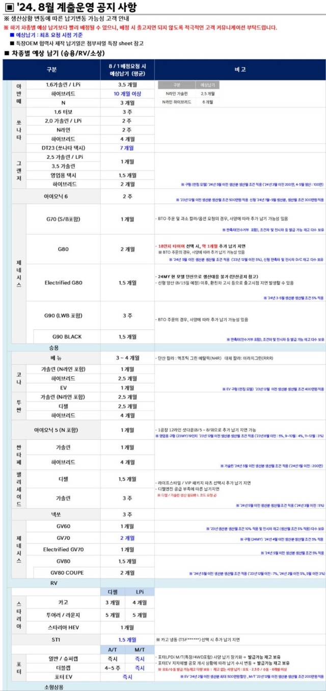 2024년 8월의 자동차 출고 운영에 관한 중요한 공지사항을 안내드립니다. 생산 상황의 변동에 따라 납기에 변동이 발생할 수 있는 점, 유의 하세요.