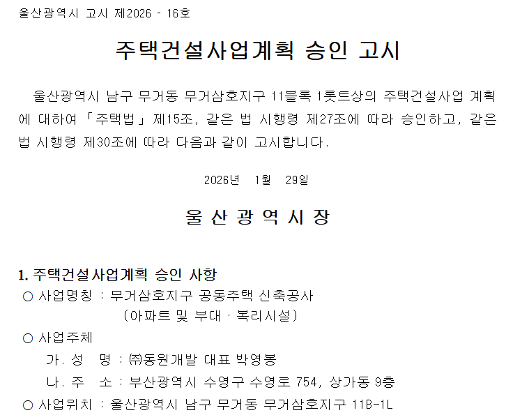 고시 내용을 보면 사업명이 “무거삼호지구 공공주택 신축공사”로 표현돼 있어서 헷갈릴 수 있는데,